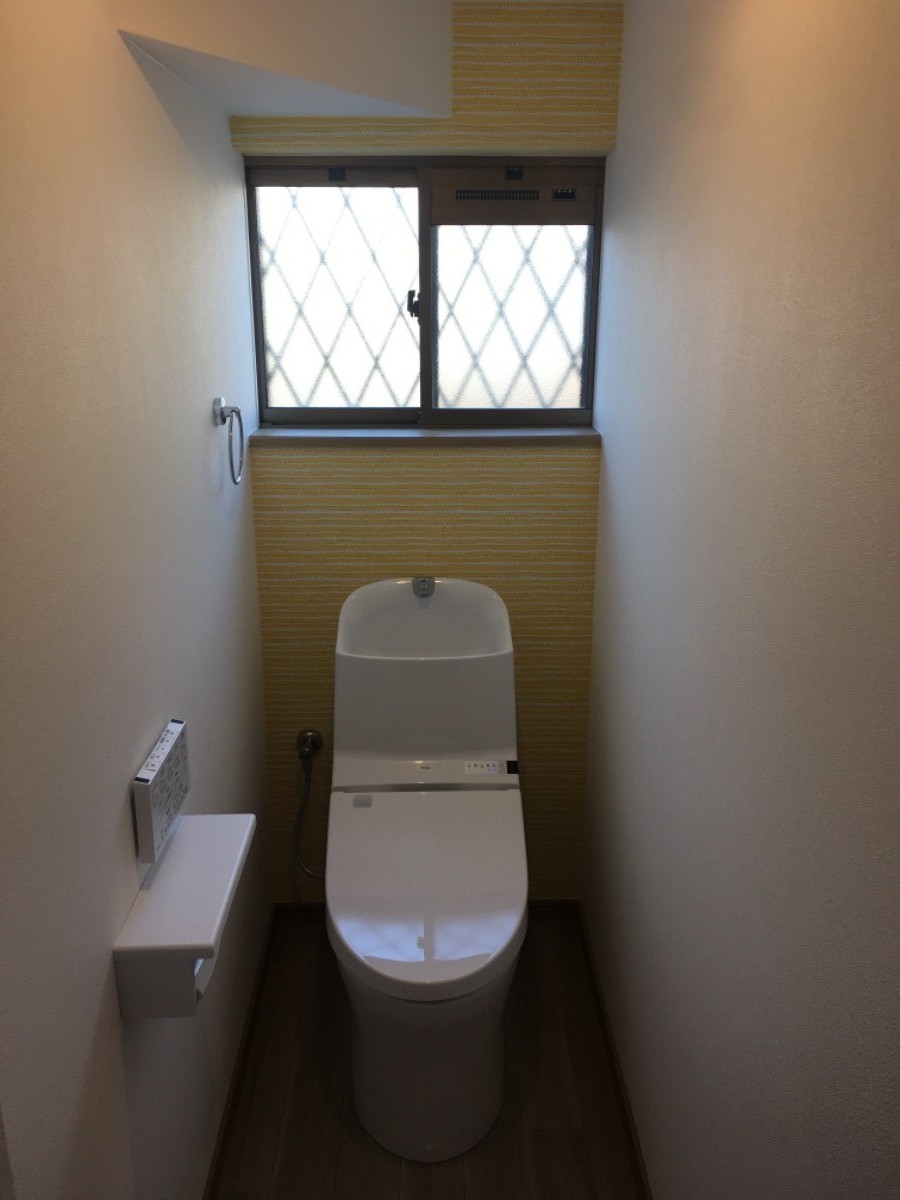 新築当時から使用してましたトイレをクロス貼り替えして便器も新品に取り替えさせていただきました。正面にポイントで、クロスをかえました。とても明るくなり、お客様も大変喜ばれてました。ありがとうございました。