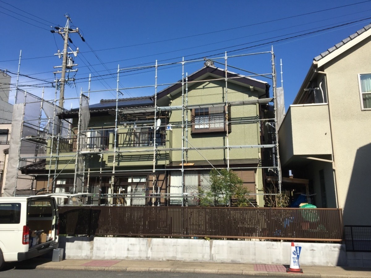 建物の周りに足場を組み、まずは高圧洗浄でしっかりと汚れを落とします 次にクラック部分をコーキングで埋め 下塗り→中塗り→上塗りの工程でローラー塗りで仕上げていきます