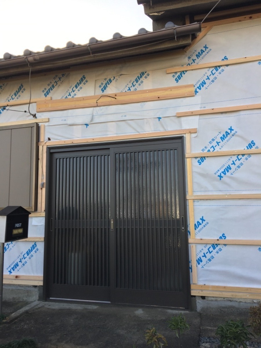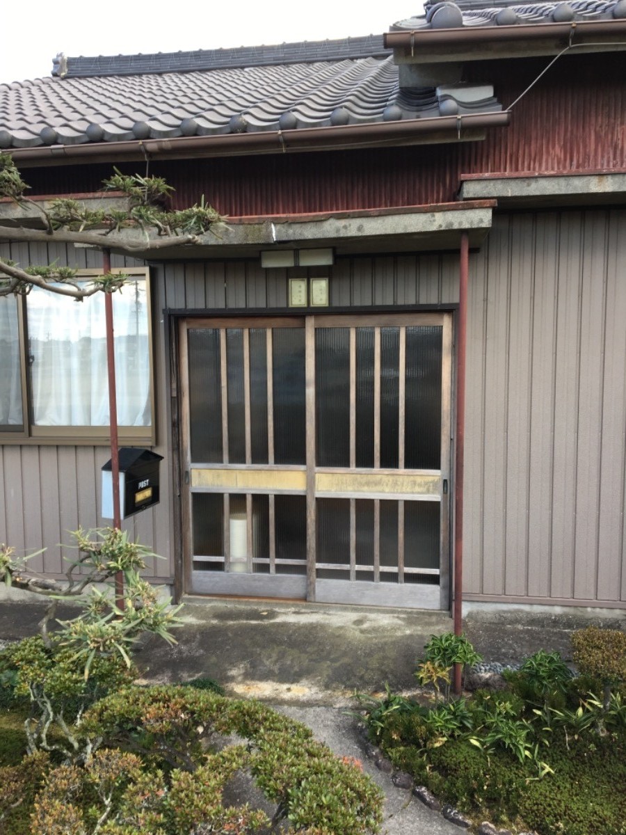 既設の玄関庇の軒裏のモルタルにクラックが入り落下する危険もあった事から玄関庇と同時に玄関引戸と外壁鋼板の張替えのリフォーム工事をさせて頂く事になりました