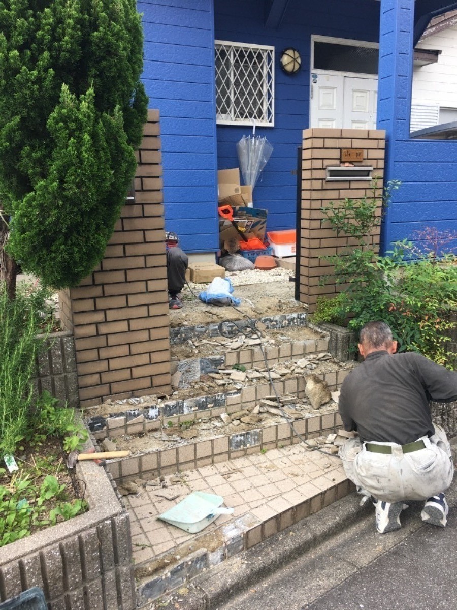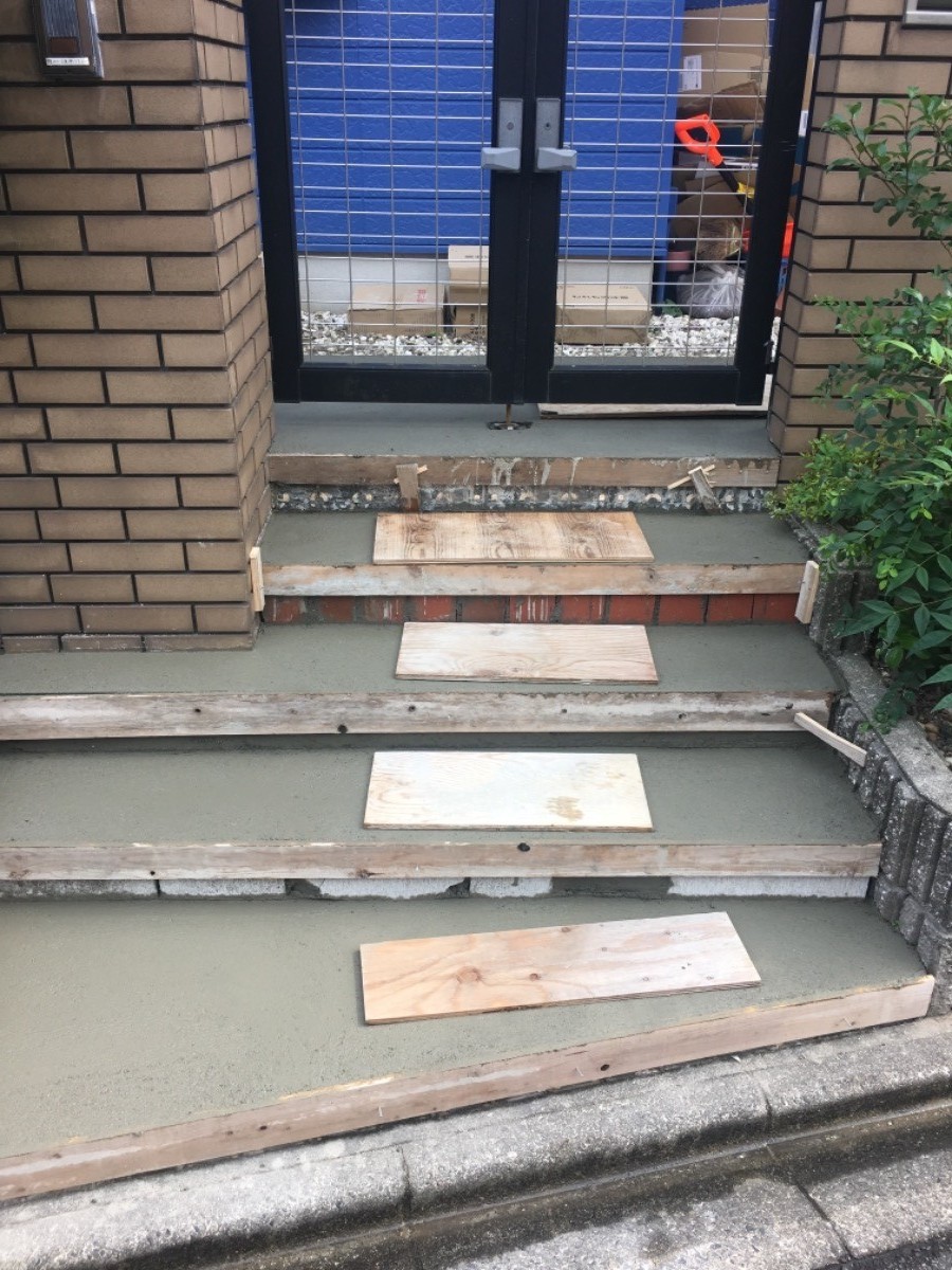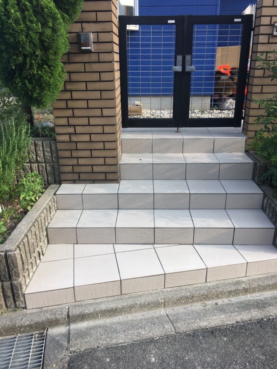 お客様からお母様が手すりがあるといいなぁ〜っと。お電話頂いて見にお邪魔すると、元々のタイルが浮いていてこのままでは手すりが取付出来る状態ではありませんでした。既設のタイルと、その下地も全て撤去して直しました。タイルは30cm角タイルを貼り、最後にY K Kの手すりを取付して完了しました。お母様が手すりが付いて階段が楽になりましたとの事でした。ありがとうこざいました。