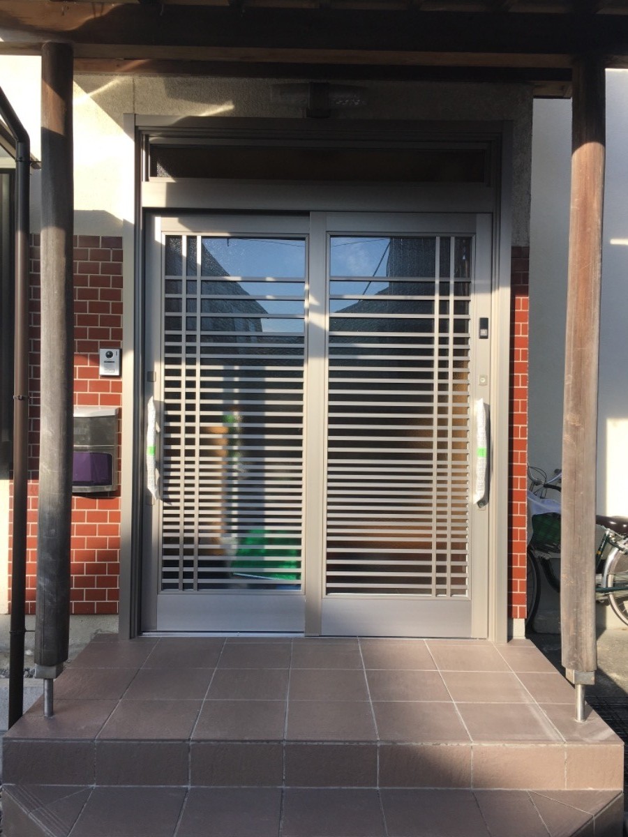 既設の玄関引戸が重くて大変だったそうです。そこで、リクシルのリフォーム用玄関引戸リシェントに取り替えしました。工事も1日で完了です。ついでにタイルも貼り替えしました。ありがとうございました。