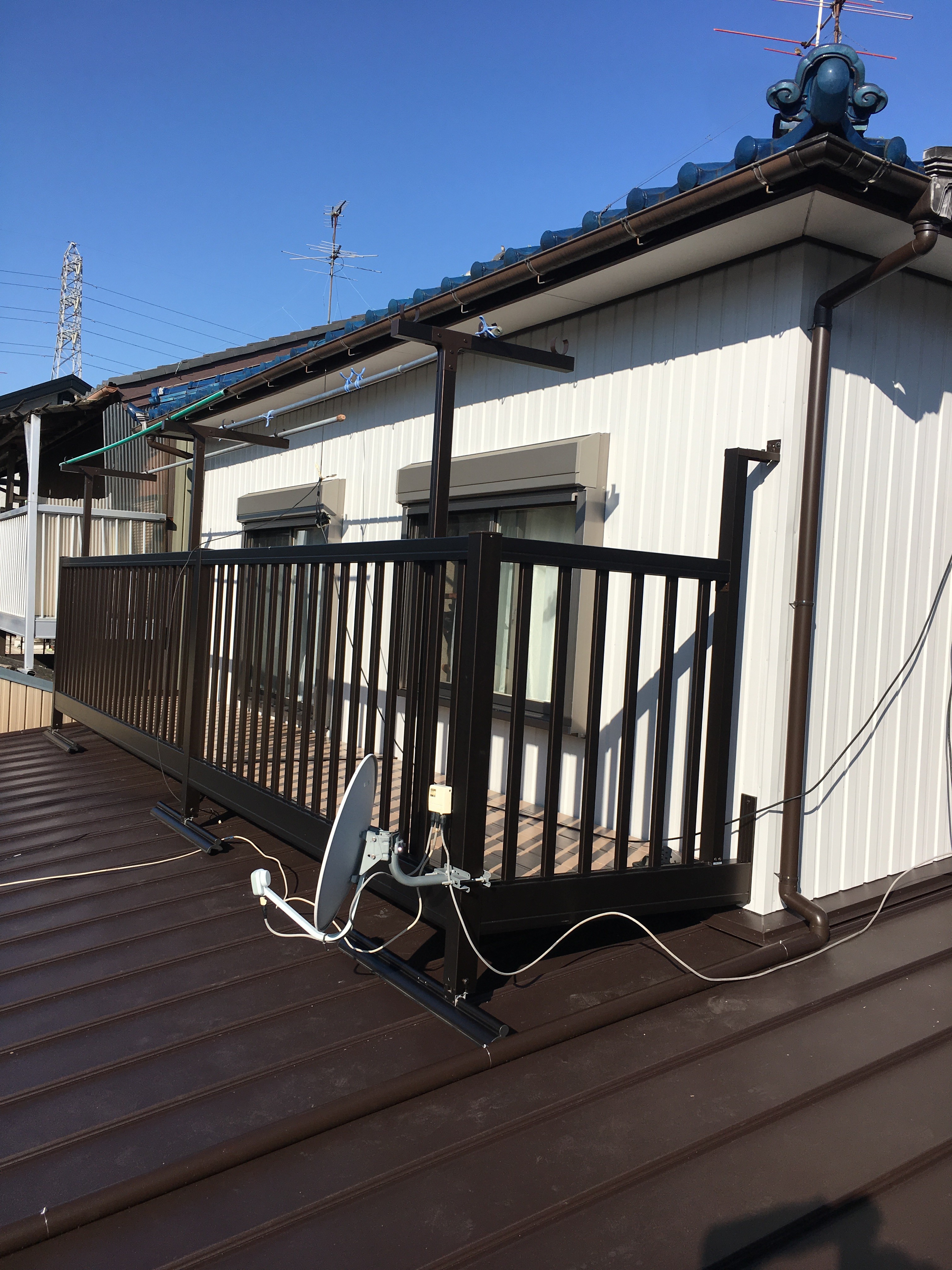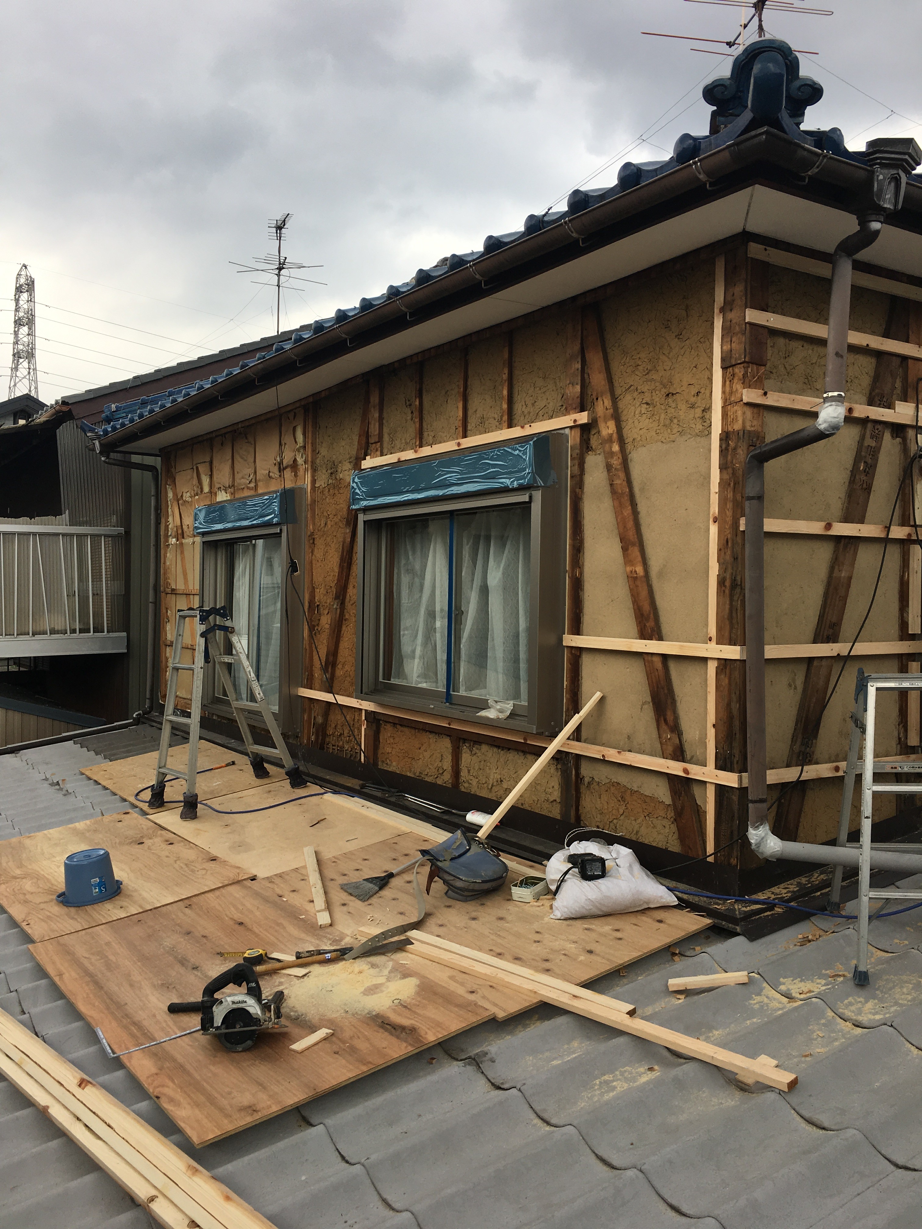 台風で雨漏りがあり原因を調査した所、屋根、外壁、サッシからの雨漏りが原因でした。そこで、まず外壁を撤去してサッシを4箇所シャッターサッシに取替して、屋根を撤去して板金の立平に葺き替えしました。最後に外壁を角浪に張り替えして、既設のバルコニーを取付して完了しました。何十年か前に増築をしたらしく、増築した時の壁、屋根の取り合いから雨漏りしてました。今回は全て取替えしたので雨漏りの心配も無くなりました。ありがとうございました。